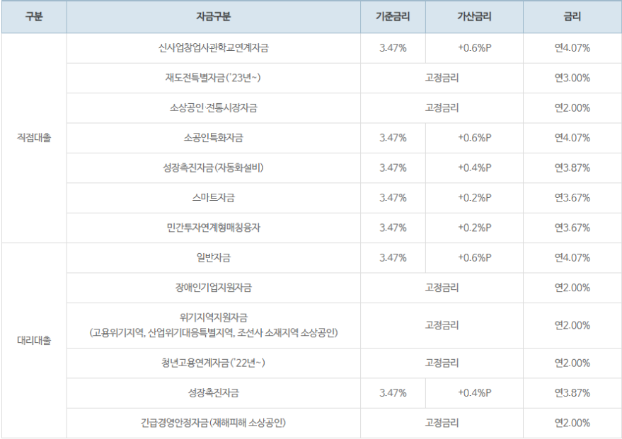 : 소공인특화자금, 성장촉진자금, 스마트자금, 민간선투자형매칭융자, 신사업창업사관학교연계자금, 소상공인전통시장자금, 재도전특별자금